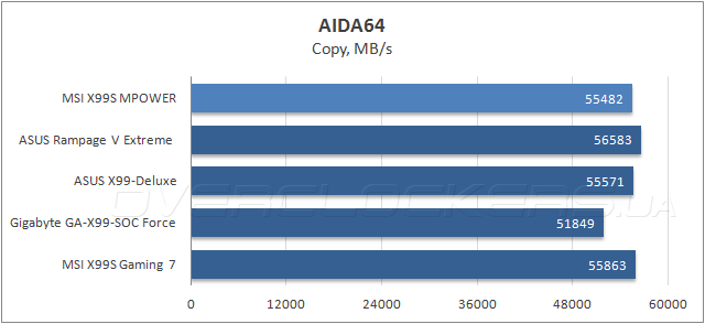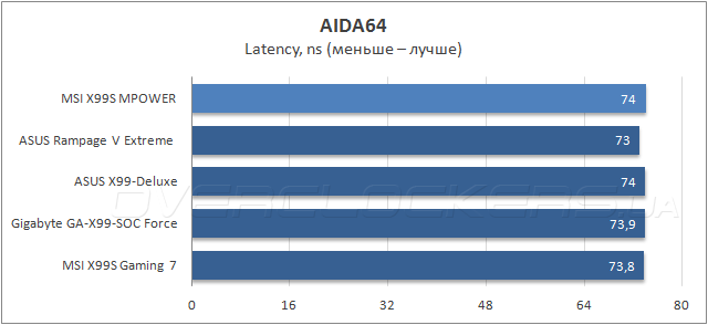 При оценке пропускной способности ОЗУ MSI X99S MPOWER получила близкие к максимальным показатели быстродействия во всех сценариях, кроме подтеста измерения латентности, в котором новинка разделила последнее место с ASUS X99-Deluxe.
