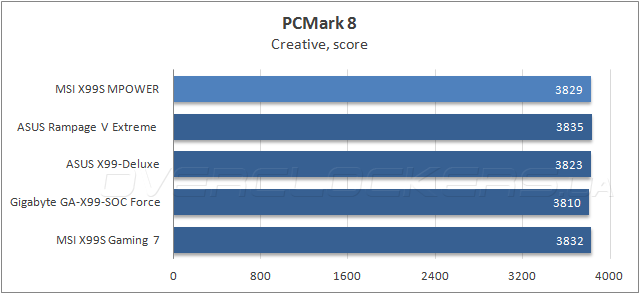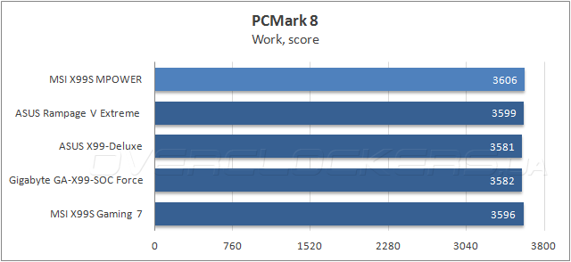 В комплексном тестовом пакете Futuremark PCMark 8, который измеряет быстродействие стендов при выполнении типичных повседневных задач, системная плата MSI выступила уверенно, показав продуктивность на уровне лучших моделей для платформы LGA2011-3.