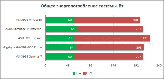 Честно говоря, результаты измерения потребляемой мощности MSI X99S MPOWER заставляли раз за разом повторять показания прибора. Но нет, это не ошибка! Просто новинка оказалась самой экономичной при нагрузке, а в простое разделила первое место с MSI X99S Gaming 7. Очевидно, дала о себе знать высокая эффективность модуля VRM, а также оптимизация управляющего микрокода.
