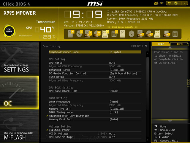 Прошивка MSI X99S MPOWER базируется на управляющем микрокоде UEFI, поверх которого работает функциональный и удобный пользовательский интерфейс Click BIOS 4. В верхней части окна отображается информационная панель, на которую выводятся дата и время, показания двух температурных датчиков, данные о параметрах быстродействия модулей ОЗУ и центрального процессора, а также сведения о прошивке. Здесь же включается функция автоматического разгона OC Genie и задается порядок инициализации загрузочных устройств.