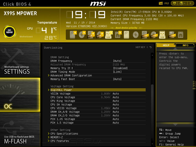 Как и подобает модели, предназначенной для работы в условиях разгона, прошивка X99S MPOWER располагает богатыми возможностями по управлению электропитанием на центральном процессоре, модулях ОЗУ и всех основных узлах материнской платы.