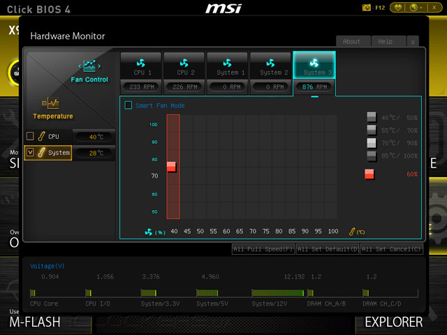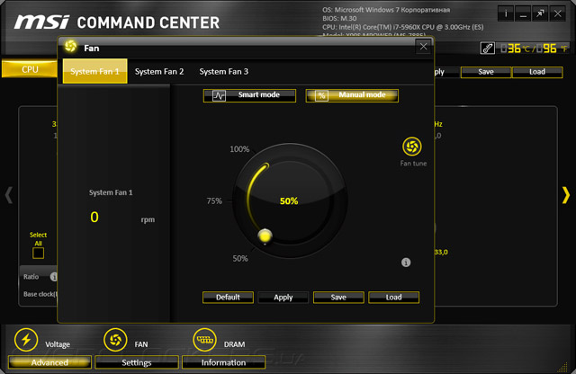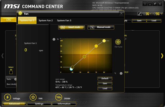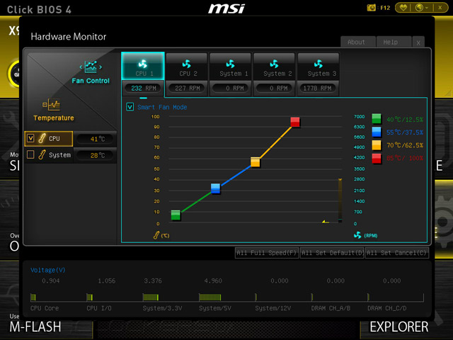 Вывода параметров аппаратного мониторинга и управление вентиляторами сосредоточены в разделе Hardware Monitor, где отображаются показания двух температурных и пяти тахометрических сенсоров, а также значения напряжений на центральном процессоре, модулях ОЗУ и основных шинах питания. Следует отметить, что как для оверклокерского продукта прошивке MSI X99S MPOWER не хватает мониторинга температуры VRM, зато, функция управления скоростью вращения «карлсонов» реализована образцово удобно. Для крыльчаток охладителей, поддерживающих четырехконтактное подключение, алгоритм работы можно настроить в зависимости от показаний температурных сенсоров, а для вентиляторов, не имеющих поддержки ШИМ, доступен режим ручного управления.