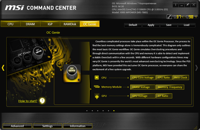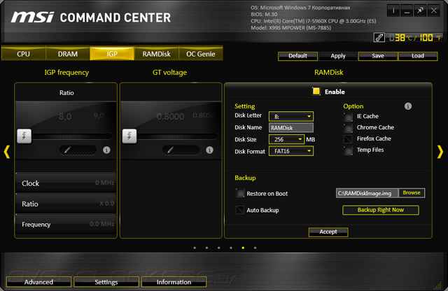 При наличии достаточного количества ОЗУ пользователи могут создать в области оперативной памяти сверхскоростной виртуальный логический диск с помощью функции RAMDisk, а при необходимости включения функции автоматического разгона — воспользоваться вкладкой OC Genie.