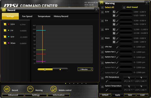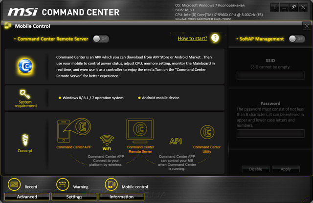 Среди возможностей MSI Command Center значится контроль показаний системного мониторинга в режиме реального времени, настройка порога срабатывания сигнализации, а также уникальная функция Mobile Control, которая позволяет управлять мультимедийными возможностями операционной системы и функциями разгона материнской платы с мобильных устройств, на которые установлена специальное приложение.