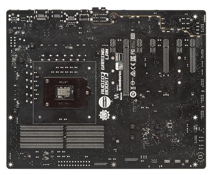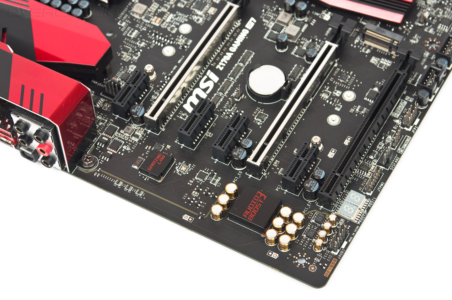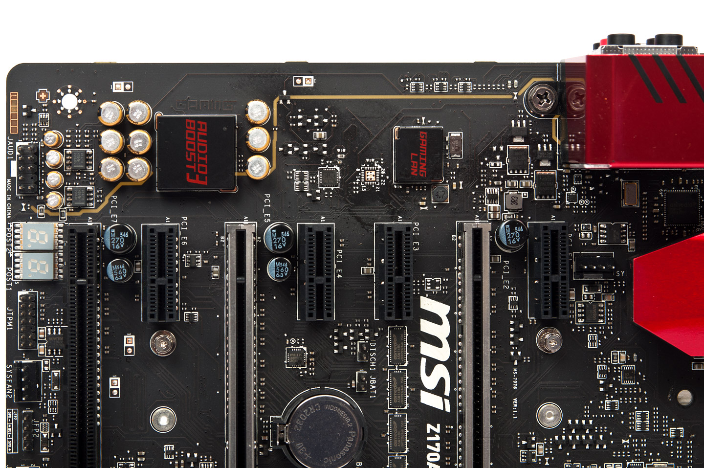 В рамках реализации звуковой и сетевой подсистем у Z170A Gaming M7 практически никаких изменений, если не считать того, что Killer обновился до модели Е2400, обладающей защитой от пробоя до 15 кВ. Оба чипа упрятаны за экранирующие элементы. Надписи статичны, их подсветка не реализована. Уже традиционно имеется протравленный участок в слоях медных проводников, сулящий лучшую изоляцию аналоговых цепей от цифровых, что положительно сказывается на выходном сигнале.