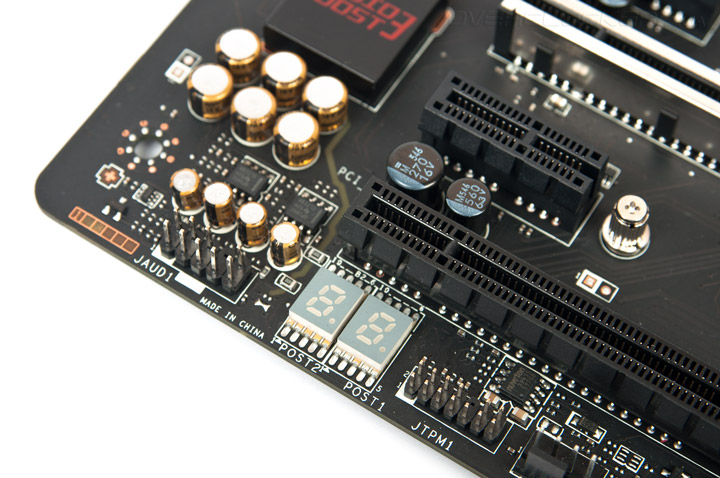 У левого края находится POST-индикатор, который в режиме работы операционной системы отображает температуру процессора, подсветка — жёлто-зеленых оттенков.