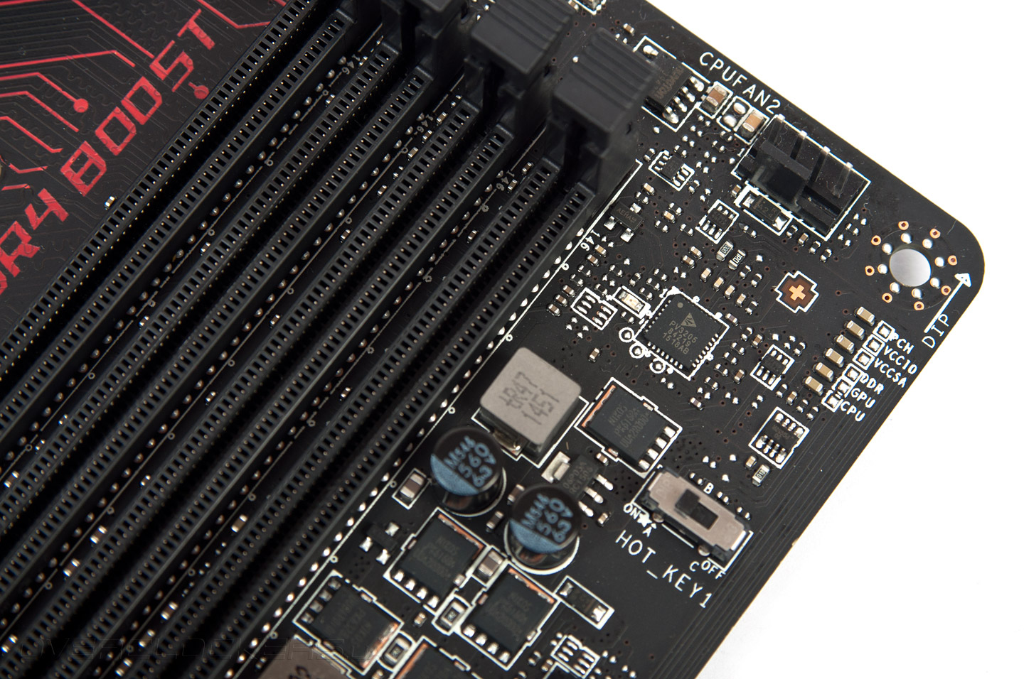 Органы управления работой устройства расположились в нижнем правом углу. Здесь есть кнопки включения и перезагрузки, имеющие зелёную подсветку, переключатель режима Slow Mode, снижающий частоту ЦП, что может быть полезно в рамках проведения сессий по бенчмаркингу. Появилась кнопка для аварийного восстановления прошивки (технология FlashBack+), для чего необходимо использовать специальный порт USB на задней панели. Наиболее интересный из элементов — переключатель состояний Game Boost, имеющий восемь положений. Ручная активация происходит в выключенном режиме ПК, а работа технологии символизируется свечением рядом расположенного красного светодиода (HW). Также можно отказаться в пользу активации режимов из UEFI, тогда загорится другой светодиод — зелёного цвета (SW).