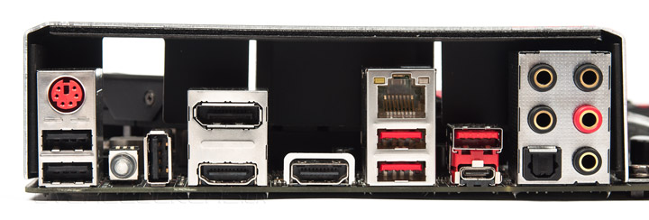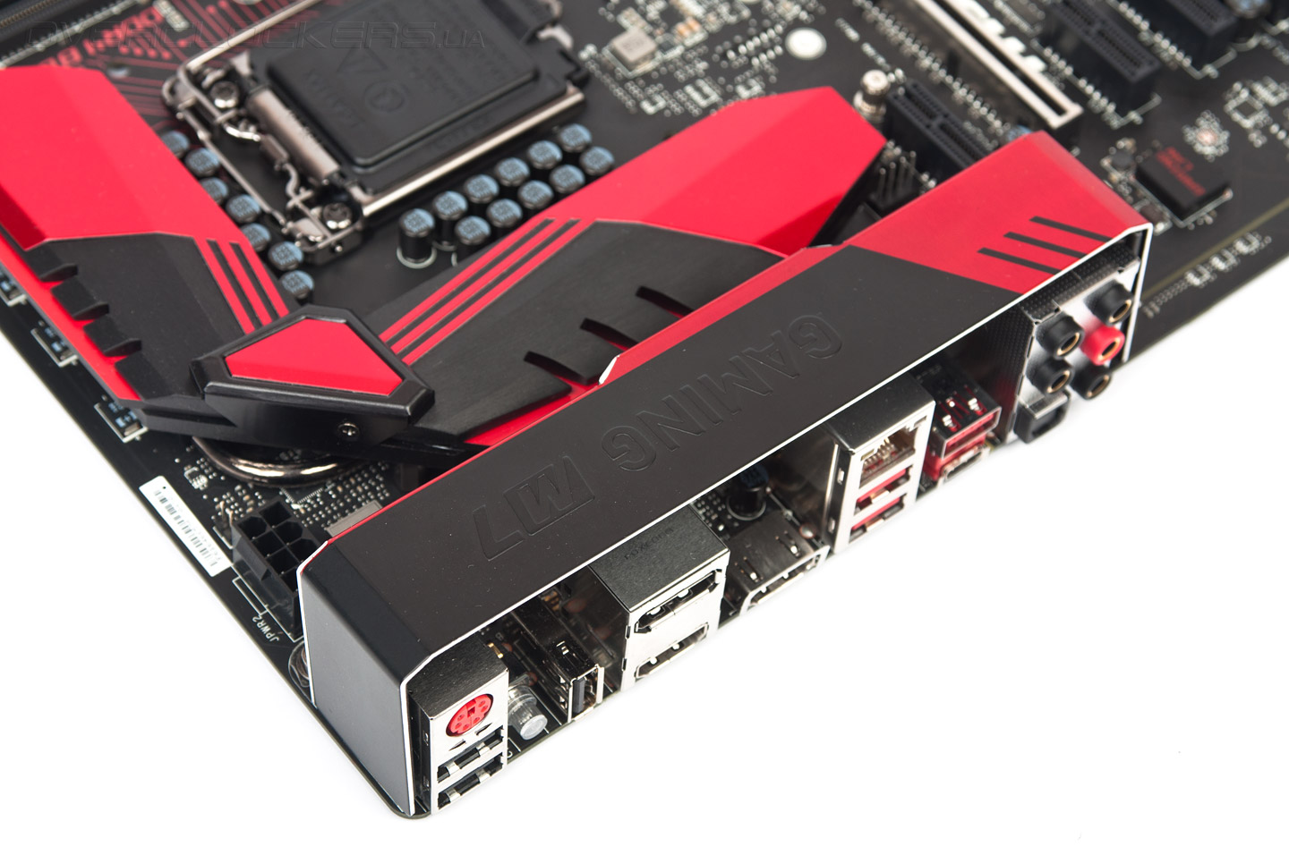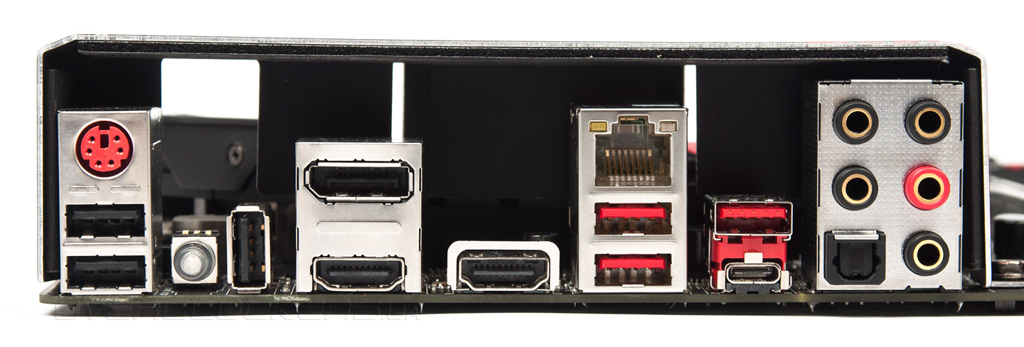 Наполнение задней панели в отношении предшествующей модели Z97 Gaming 7 выглядит немного беднее, а всё из-за внедрения USB 3.1 Gen2, здесь имеются оба современных типа гнезда — A и С, причем по последнему сила тока может достигать 3 А. Но в общем итоге количество выходов USB нельзя назвать малым. Также имеются три цифровых видеовыхода, оба HDMI оснащены конвертерами уровней сигналов PTN3360D. Кнопка сброса настроек обзавелась подсветкой синего цвета, а единственный PS/2 обещает повышенную отзывчивость игровых манипуляторов.