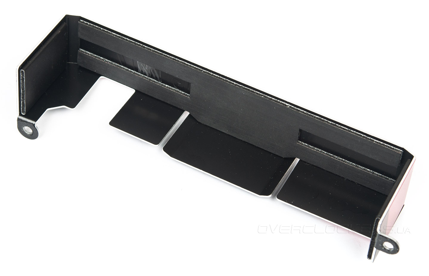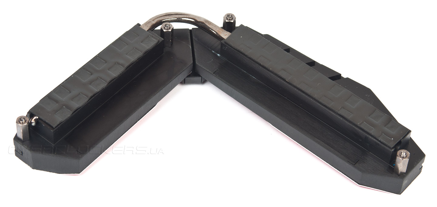В основе охлаждающей конструкции лежит тепловая трубка. Неравноценные по площади радиаторы связаны, что позволит более равномерно распределять нагрев. Половина силовых элементов имеет непосредственный контакт с трубкой — через термопрокладку серого цвета, другая половина контактирует уже напрямую с радиаторами. Общий вес элемента весьма приличен, теплоёмкость должна быть высокой. А вот продуваемость невысока ввиду отсутствия ребер как таковых.