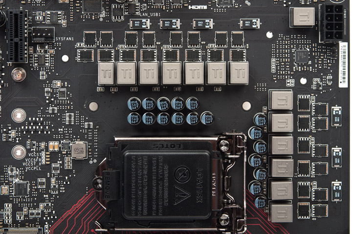 Поскольку FIVR теперь отсутствует в составе CPU, основные напряжения процессору необходимо получать непосредственно с платы. Их нынешний состав выглядит так: CPU и GPU Voltage, VCCSA и VCCIO Voltage (как вспомогательные). CPU Ring самостоятельно формируется неведомым образом (внутри ЦП) из основного — CPU Voltage. Основным ШИМ-контроллером выступает ISL95856 от Intersil Corporation. В него заложены возможности стабилизации двух независимых напряжений посредством четырёх и трёх каналов, при этом внутри контроллера уже находятся соответственно два и один драйвер. На обратной стороне платы можно найти ещё три вспомогательных элемента, коими возможно и выступают внешние драйверы ISL6625A, указанные как типичные в документации на сам контроллер. Согласно проведённым измерениям, удалось установить следующее: CPU Voltage формируется посредством четырёх каналов, а GPU Voltage — двух. Очевидно, имеет место удвоенное число элементов в составе каждого из них. Оставшийся тринадцатым дроссель, немного уменьшенных размеров по отношению к остальным, принимает участие в работе стабилизатора VCCSA Voltage. Нынешний образец ШИМ-контроллера полностью подтвердил не самую выдающуюся репутацию своего предшественника в лице ISL95820, повсеместно применяющегося в недорогих решениях на базе Z97, но об этом немного позже. В качестве силовых элементов использованы проверенные по предыдущему поколению плат PK616BA и PK632BA от Niko Semiconductor.