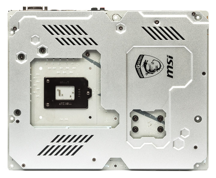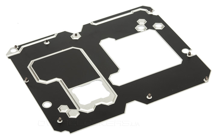 Сзади находится массивная прижимная пластина. Она не стала помощницей в охлаждении каких-либо зон на плате, её функции сведены к защите и армированию.