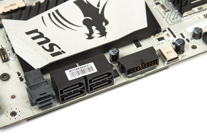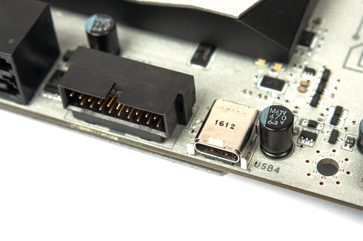 Дополнительного контроллера для накопителей нет. Разъём U.2 довольствуется только линиями PCI-E от PCH. Продольно расположенные нативное гнездо типа С и колодки для подключения корпусных кабелей с гнёздами USB относятся к начальному типу интерфейса третьей ревизии. Более свежую версию следует ожидать от чипсетов нового поколения — «двухсотой» серии.