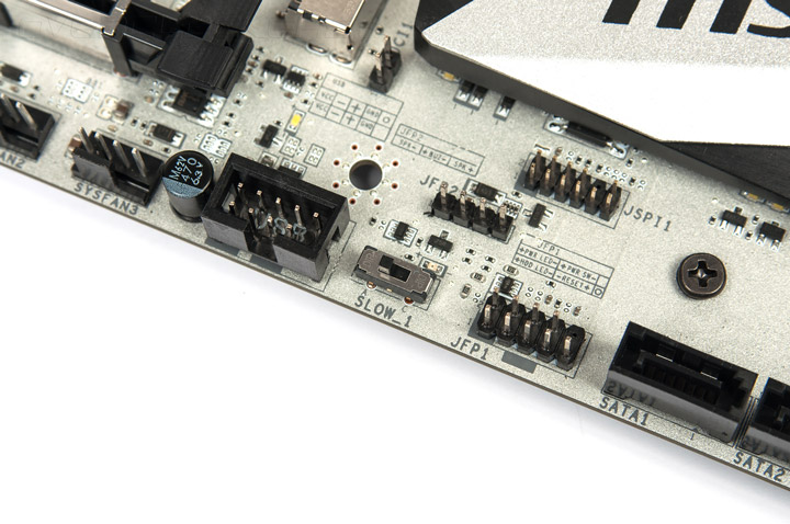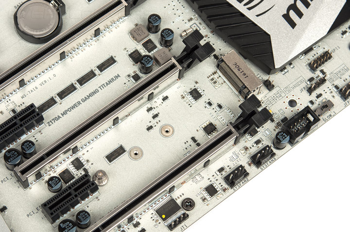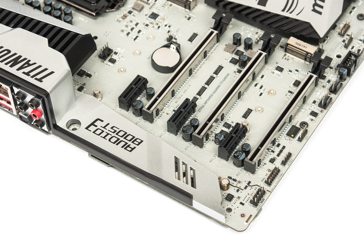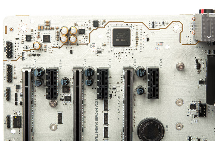 Звуковая система выглядит поскоромнее даже на фоне родственной Z170A XPower Gaming Titanium Edition. Но всё традиционное для нынешних игровых плат здесь есть: специальные японские конденсаторы Nippon, целых три операционных усилителя, подсветка белого цвета, не сильно яркая. Об управлении индикацией речь пойдёт в следующей части обзора.