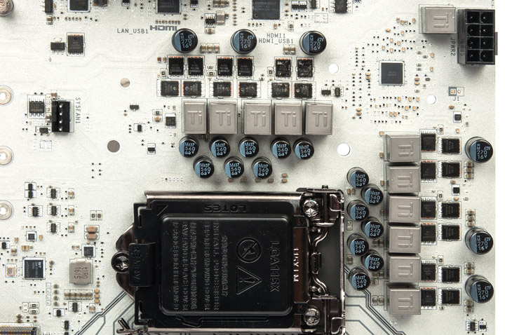 Стабилизатор основан на ШИМ-контроллере от uPI Semiconductor — uP9506. Этот шаг разительно отличается от прочих плат для Skylake-S, где преимущество на стороне продуктов от Intersil Corporation и куда реже можно увидеть перемаркированные контроллеры от International Rectifier. Официальная документация гласит о его возможностях вида 3+2 фазы, внутри встроено три драйвера. На плате видно ещё недостающие два. Однако измерения показывают использование двух пар транзисторов для нужд интегрированного ГП и восьми пар — для ЦП. Ещё две пары завязаны на меньший дроссель, там формируется напряжение CPU SA. Какую именно реализацию осуществили инженеры компании сказать довольно сложно, главное — как проявит себя такое решение при разгоне. Транзисторы используются привычные для продукции MSI — PK616BA и PK632BA от Niko Semiconductor.