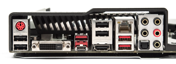 Наполнение задней панели полностью идентично модели Z170A Gaming Pro Carbon, имеющей явно не оверклокерские корни. В частности, было бы неплохо увидеть здесь кнопку для сброса настроек BIOS, ведь её нет и на самой плате, в случае необходимости, придётся замыкать по-старинке группу контактов. Более замечаний нет. Восемь выходов USB разных поколений и типов, пара цифровых видеовыходов, пять позолоченных аудиогнёзд. Сетевое гнездо имеет встроенную красную подсветку. Порт HDMI оснащён конвертером уровней сигналов PTN3360D.