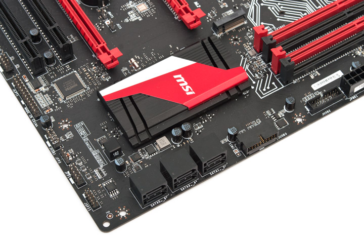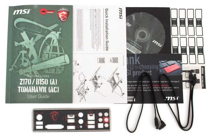 Использована полноформатная плата, тесноты размещения элементов на ней нет. Строгие элементы чёрных оттенков дополняют некоторые яркого красного цвета. Не будет лишним отметить, Z170A Tomahawk по сути повторяет собой модель Z170A-G43 Plus; кроме цветовой палитры, отличие заключается в разных звуковых кодеках, если ориентироваться по официальным характеристикам продуктов.