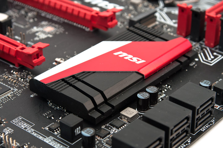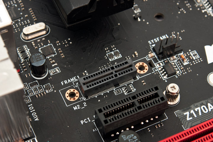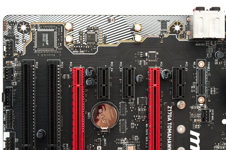 SLI на плате организовать не получится, все шестнадцать линий PCI-E от процессора замкнуты на верхний полноформатный PCI-E x16. Второй, такого же красного цвета, работает от PCH. Туда подведены четыре линии. В случае использования меньших гнёзд PCI-E x1, линии будут распределены, в итоге на нём может остаться всего одна действующая.