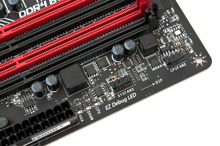 Группа из трёх красных светодиодов образует диагностический комплекс EZ Debug LED, а ближе к слотам памяти разместили четвёртый, символизирующий активацию XMP.