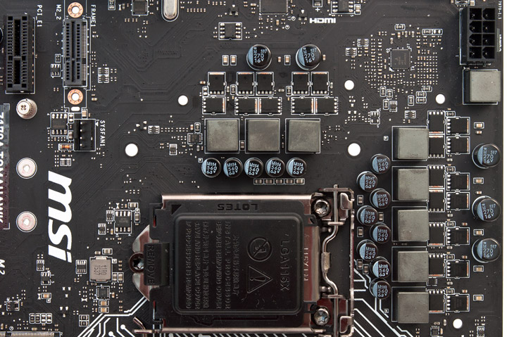 Стабилизатор питания основан на ШИМ-контроллере ISL95856 от Intersil Corporation. Он весьма популярен у производителей плат, использована максимальная схема его возможностей — 4+3 фазы. Внутри есть 2+1 драйвер, в соответствии этому, ещё четыре распаяли на плате, по паре на каждой из сторон. Для нужд встроенного графического адаптера заготовили шесть силовых элементов, по одному транзистору от Niko Semiconductor на каждый из каналов — PK616BA и PK632BA. Для вычислительных ядер число удвоили, суммарно получилось шестнадцать транзисторов, по четыре на каждый из каналов. Ещё один дроссель, примкнувший к общему числу, включен в цепь питания для напряжения CPU SA, где не обошлось без пары уже указанных элементов.