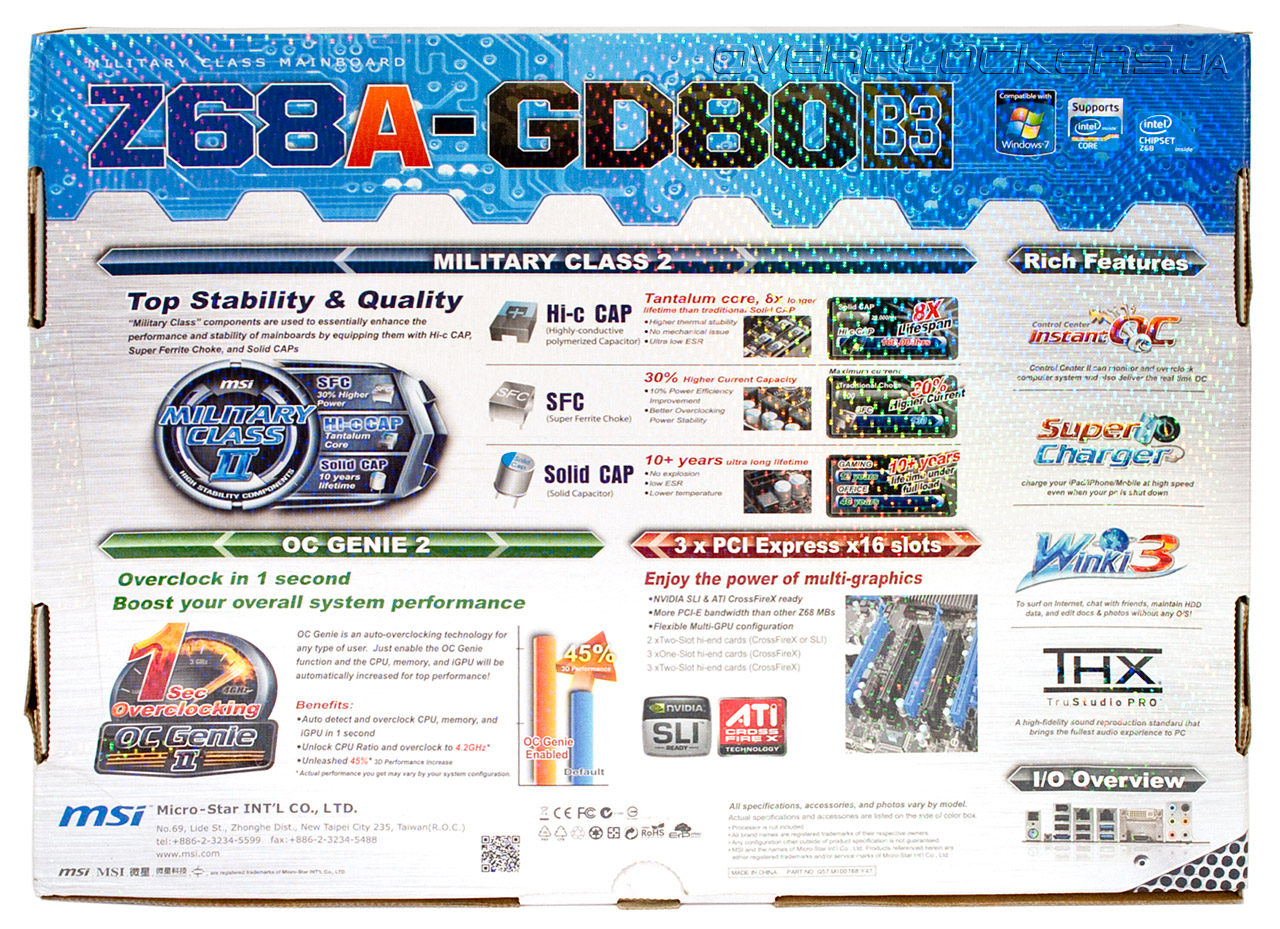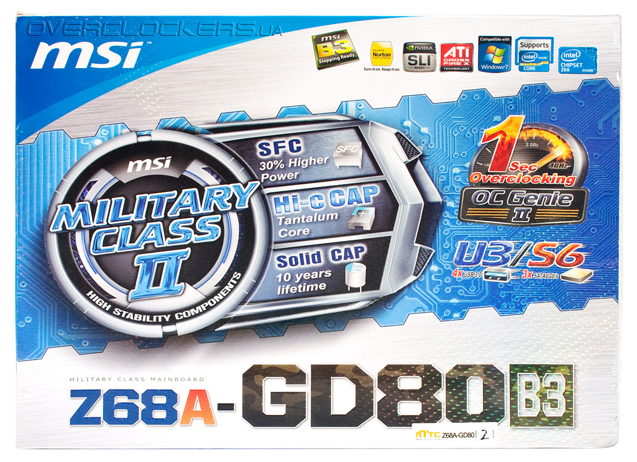 Кроме того, дизайн упаковки должен сразу сообщать покупателю о преимуществах конкретной модели и выделять продукт на фоне конкурентов. Оформление коробки MSI Z68A-GD80 (B3) выполнено в стиле, характерном для всех последних продуктов компании, а наличие суффикса В3 в названии говорит о принадлежности набора системной логики к новейшей ревизии.