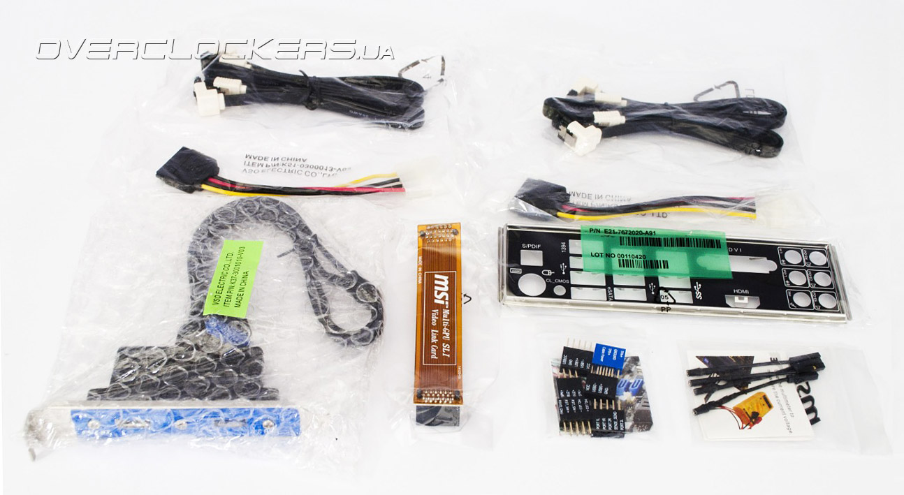 Комплект поставки радует наличием достаточного количества кабелей SATA 6 Гбит/с, мостиком SLI и планкой с разъемами USB 3.0.