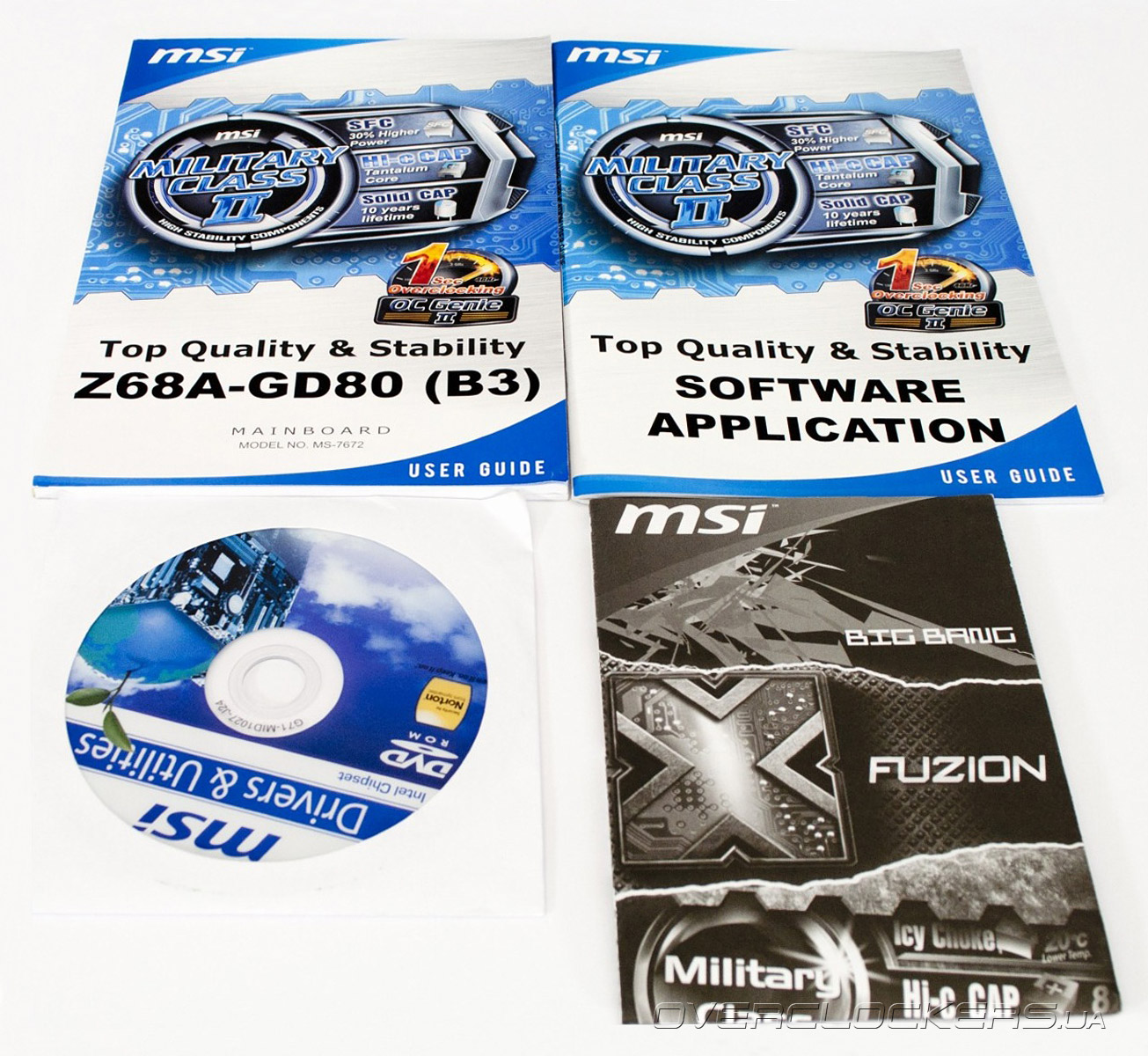 Одно из центральных мест в оформлении занимает логотип OC Genie II. Под этим названием скрывается аппаратно-программный комплекс, который позволяет максимально оптимизировать производительность системы и полностью раскрыть потенциал ее быстродействия. Энтузиасты оценят разнообразие тонких настроек, а новички смогут воспользоваться функциями автоматического разгона. Но, работа системы в экстремальных режимах была бы невозможна без качественной элементной базы, которая у MSI Z68A-GD80 (B3) соответствует стандарту качества Military Class II. Этот стандарт означает использование электронных компонентов военного класса надежности, которые предназначены для работы в условиях повышенных температур, перепадов давления и жестких ионизирующих излучений, т.е. способны выдержать небольшой ядреный взрыв. Применительно к гражданской продукции, использование такой элементной базы гарантирует стабильную и долгую работу. Подсистема питания MSI Z68A-GD80 (B3) спроектирована с учетом концепции Extreme Power Design, которая означает дублирование силовых элементов для снижения нагрузки на них и обеспечения оптимального температурного режима. Загадочная технология U3/S6 означает полную поддержку перспективных высокоскоростных стандартов USB 3.0 и SATA 6 Гбит/с. Ну а с фирменным Click BIOS мы уже знакомы по предыдущим обзорам системных плат MSI. Об этих и других особенностях мы еще поговорим в процессе изучения дизайна, а пока рассмотрим комплект поставки MSI Z68A-GD80 (B3).