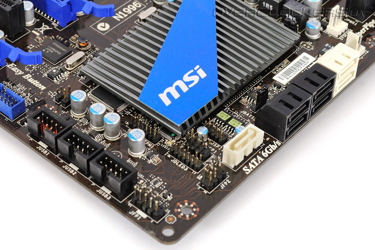 Система охлаждения материнской платы MSI Z68A-GD80 (B3) состоит из двух массивных радиаторов на силовых элементах преобразователя питания процессора и небольшого плоского радиатора на микросхеме PCH.