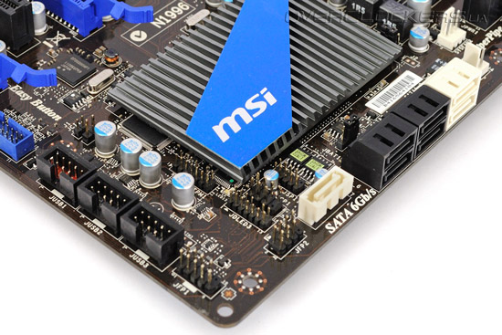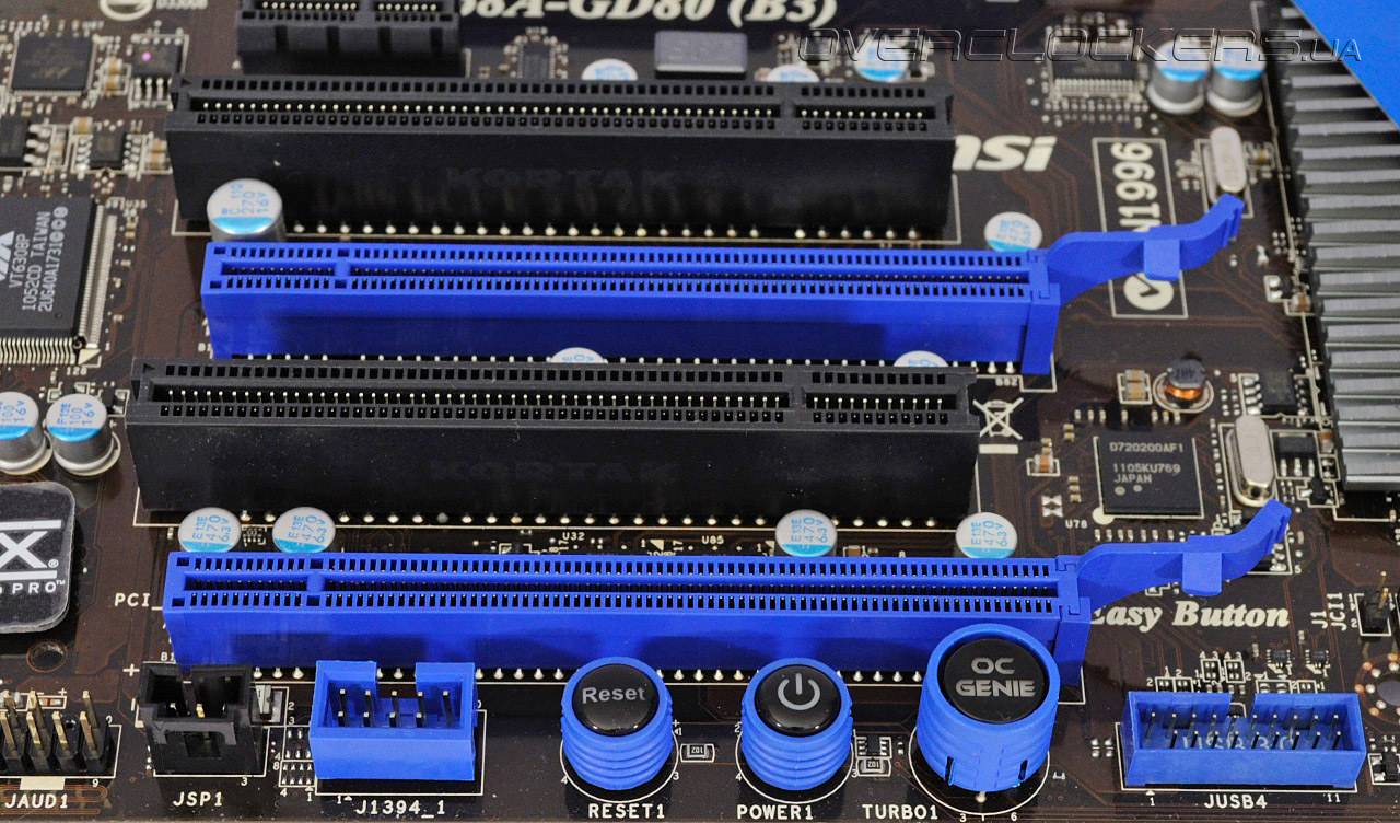 На нижнем краю платы расположились аппаратные кнопки Power и Reset, которые здорово облегчают процесс разгона на открытом стенде, а также клавиша активации режима автоматического подбора оптимальных параметров OC Genie.