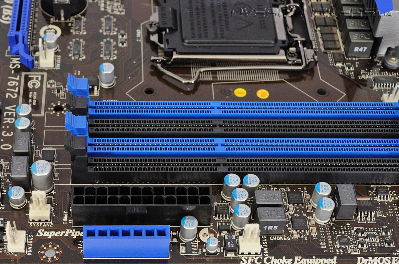 В качестве силовых элементов применяются интегральные сборки DrMOS, ставшие уже традиционными для высокоуровневых системных плат MSI. Кроме того, в электрических цепях применяются катушки индуктивности закрытой конструкции и конденсаторы с твердым электролитом на основе соединений тантала. Все эти меры направлены на уменьшение нагрева и увеличение стабильности в условиях повышенных нагрузок, которые характерны для работы системы в режиме разгона. Уникальной особенностью Z68A-GD80 (B3) является наличие на плате шестиконтактного разъема дополнительного питания. Как вы знаете, видеопамять большинства графических акселераторов получает питание от шины PCI Express. Примененное инженерами MSI решение увеличивает стабильность работы видеоподсистемы в конфигурациях CrossFireX и SLI, а также может увеличить разгонный потенциал видеопамяти.
