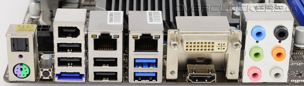 Здесь можно обнаружить комбинированный PS/2, четыре разъема USB 2.0 и пару USB 3.0. К услугам пользователя пара гигабитных сетевых интерфейсов, по одному порту eSATA 6 Гбит/с и IEEE 1394. Полный набор аудиовыходов, включая оптический S/PDIF, дополняют разъемы для подключения монитора DVI-D и HDMI. Завершает картину кнопка CLR_CMOS, актуальность которой трудно переоценить во время смелых экспериментов по разгону. На наш взгляд, набор интерфейсов задней панели вполне соответствует высокому классу системной платы.