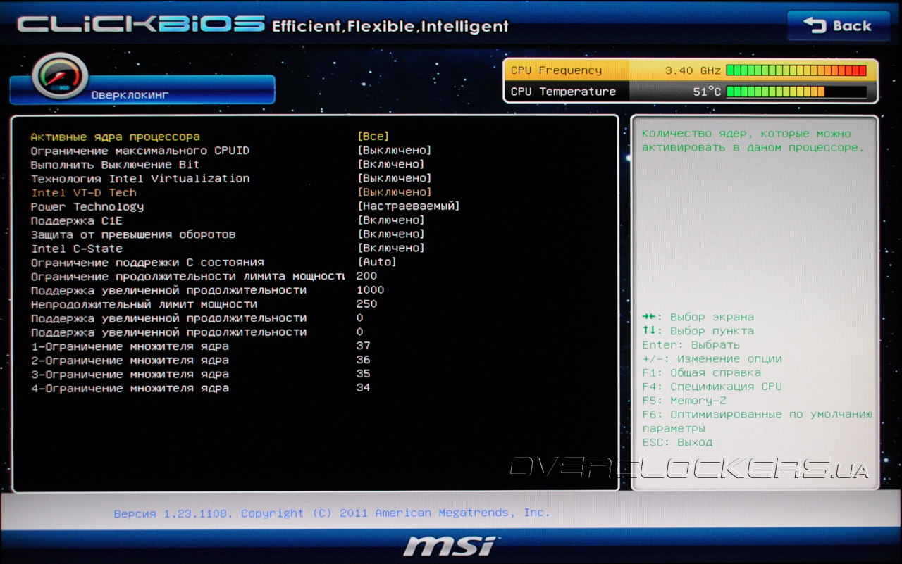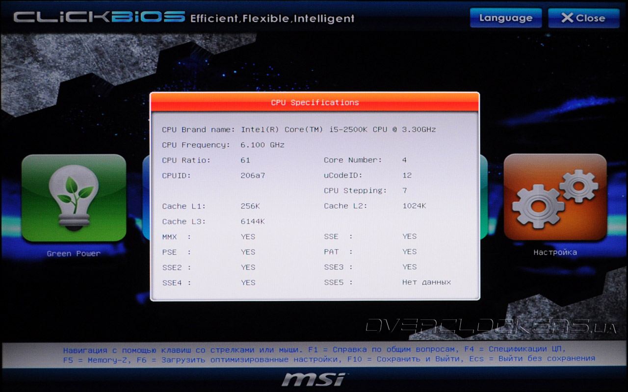 Все надписи переведены грамотно и вполне корректно, лишь только для Green Power в русском языке не нашлось близкого по значению понятия, а разработчики не решились на дословный перевод. Нажатием на клавишу «F4» вызывается всплывающее окно, отображающее основные параметры центрального процессора. Технический язык не требует перевода, все и так понятно.
