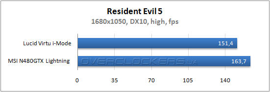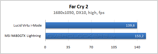 Для оценки работоспособности технологии графической виртуализации было проведено несколько тестов в играх Far Cry 2, Lost Planet 2 и Resident Evil 5, а также синтетическом тестовом пакете Futuremark 3DMark Vantage 1.1.0. Сравнивалась скорость работы в режиме i-Mode и чистая производительность дискретной видеокарты MSI N480GTX Lightning (GeForce GTX 480).