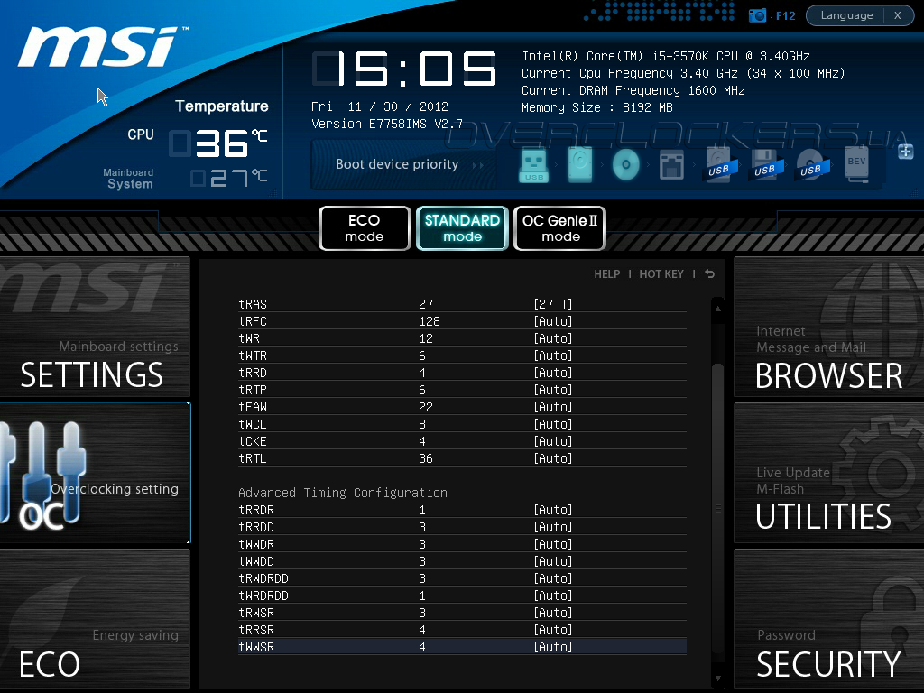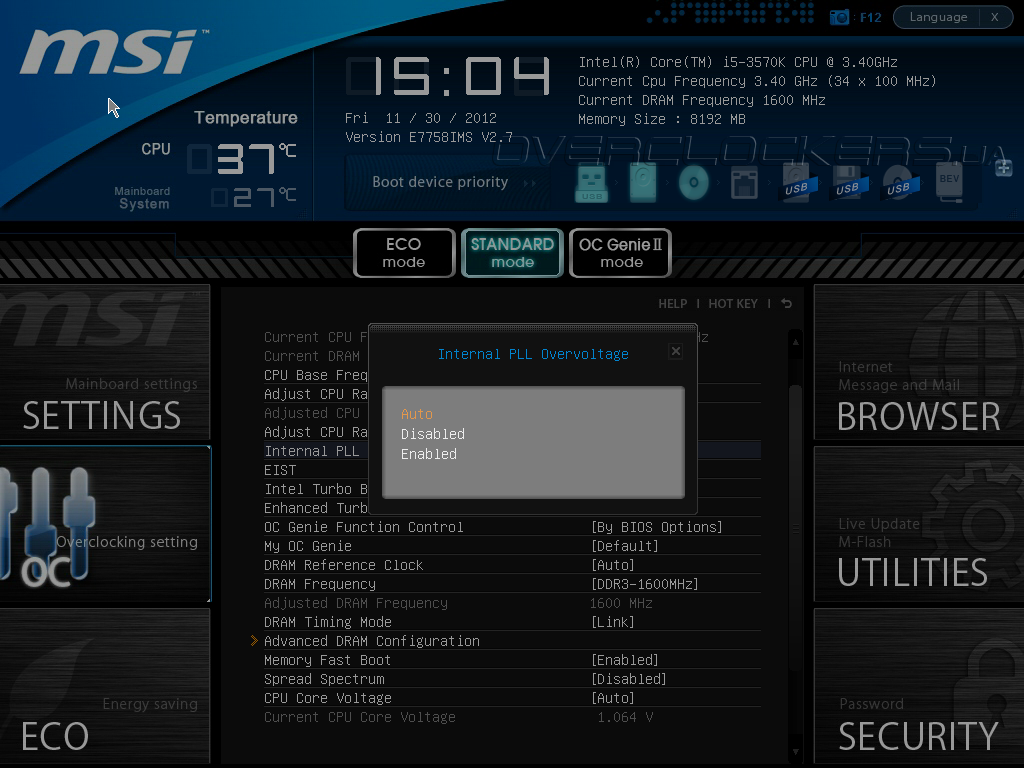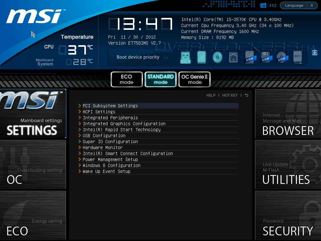 Для входа в меню настроек UEFI необходимо воспользоваться клавишей Del; для вызова загрузочного меню — F11, все вполне стандартно. Интерфейс и дизайн нового меню уже изучался в наших обзорах, и сегодня не стоит ожидать никаких сюрпризов от нашей платы.