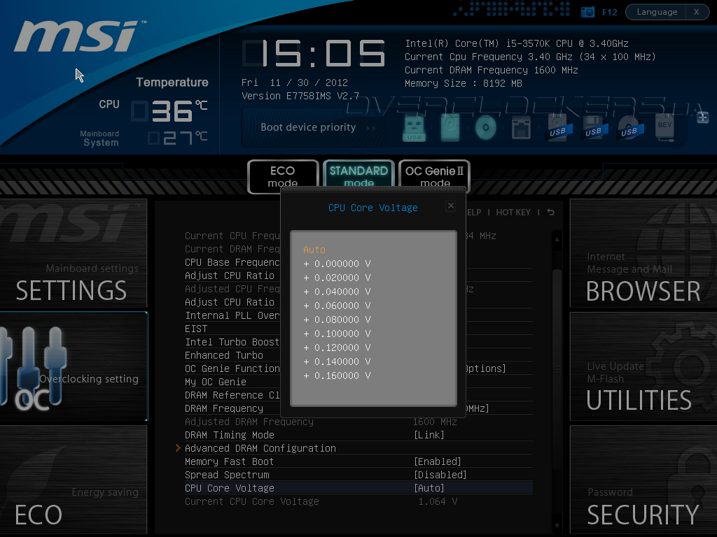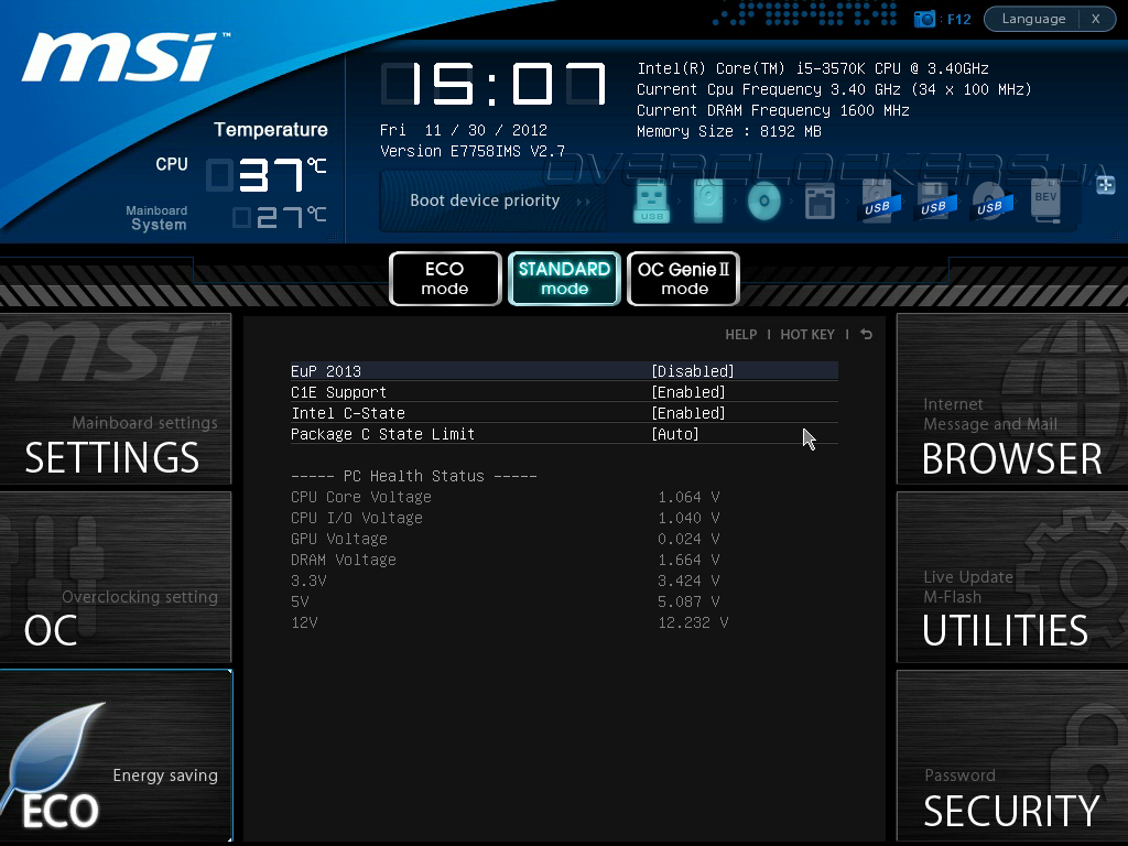 В разделе ECO продублированы некоторые пункты, отвечающие за работу энергосберегающих технологий. Здесь также находятся значения действующих напряжений, что может показаться несколько странным для тех, кто привык их искать в Hardware Monitor.