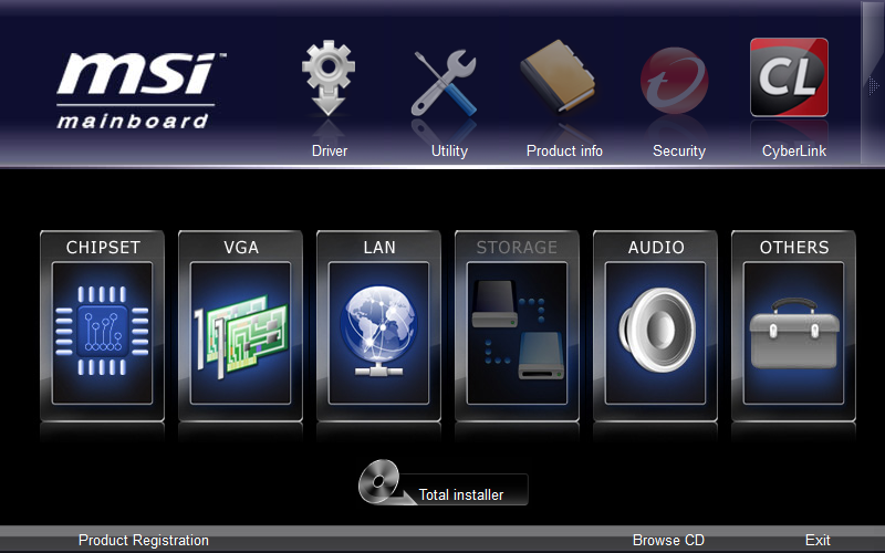 На диске, что поставляется в комплекте с Z77A-G43, находится привычный набор драйверов. Для запуска установки единым пакетом предусмотрена кнопка Total installer. Приятно, что перед стартом установки можно выбрать необходимые компоненты, а сама установка проходит в видимом режиме с использованием таймера обратного отчета.