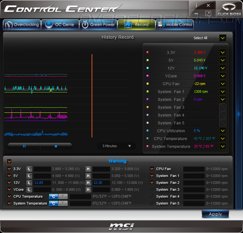 Интересной выглядит вкладка Record, в которой отслеживатся все важные показатели системы: напряжения, температуры, обороты вентиляторов. Кроме этого предусмотрен функционал алертов по выставляемым значениям. Правда, все графические кривые намешаны в одной области координат, соответственно отсутствует хоть какая-либо цена деления.
