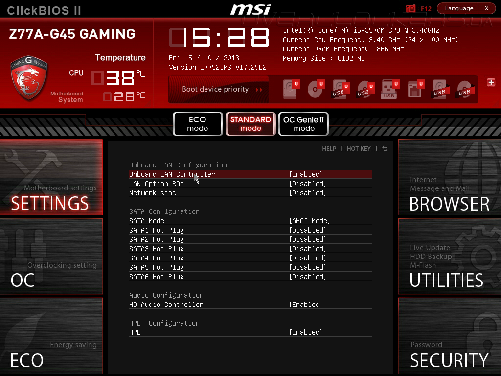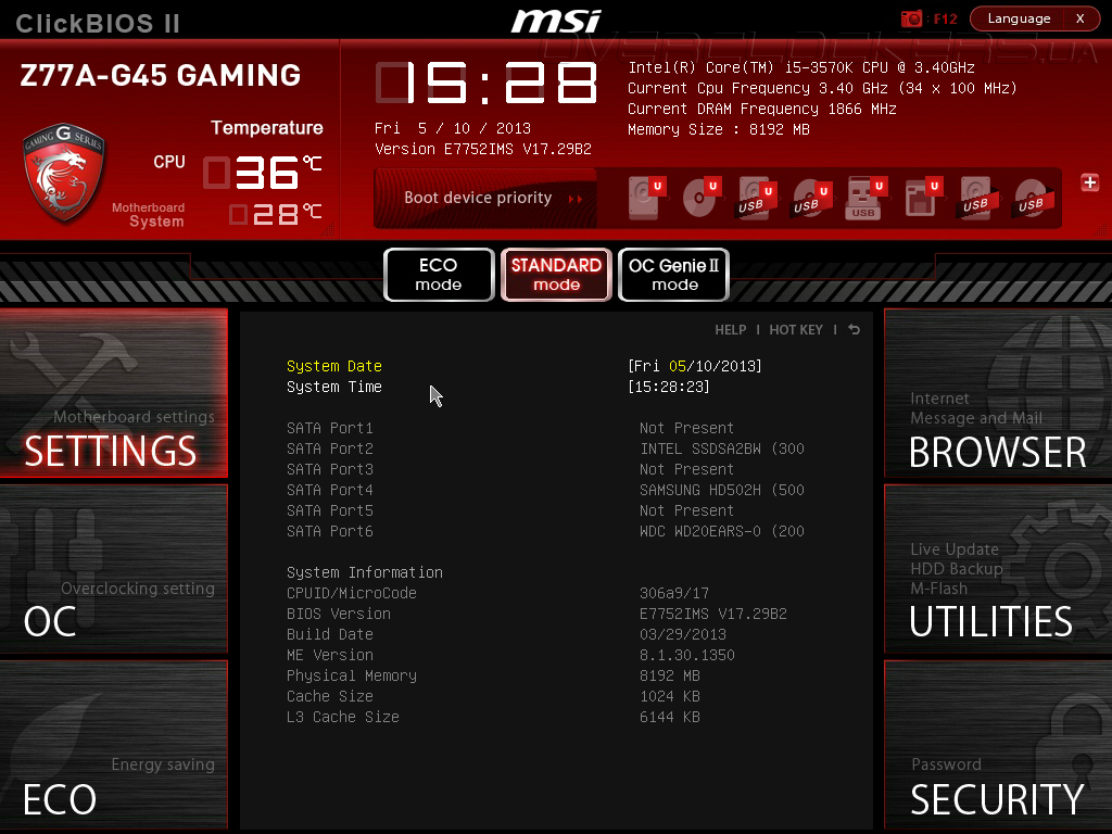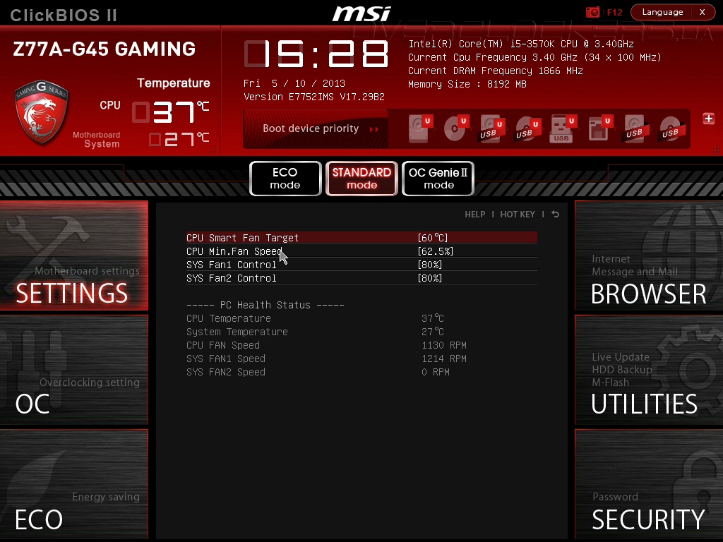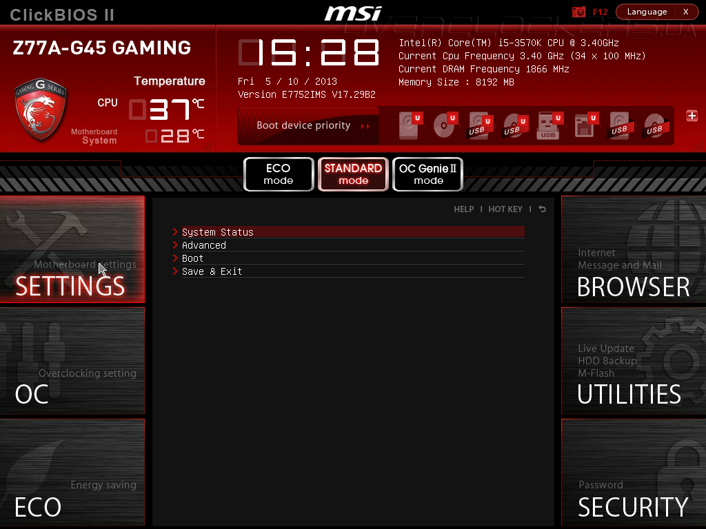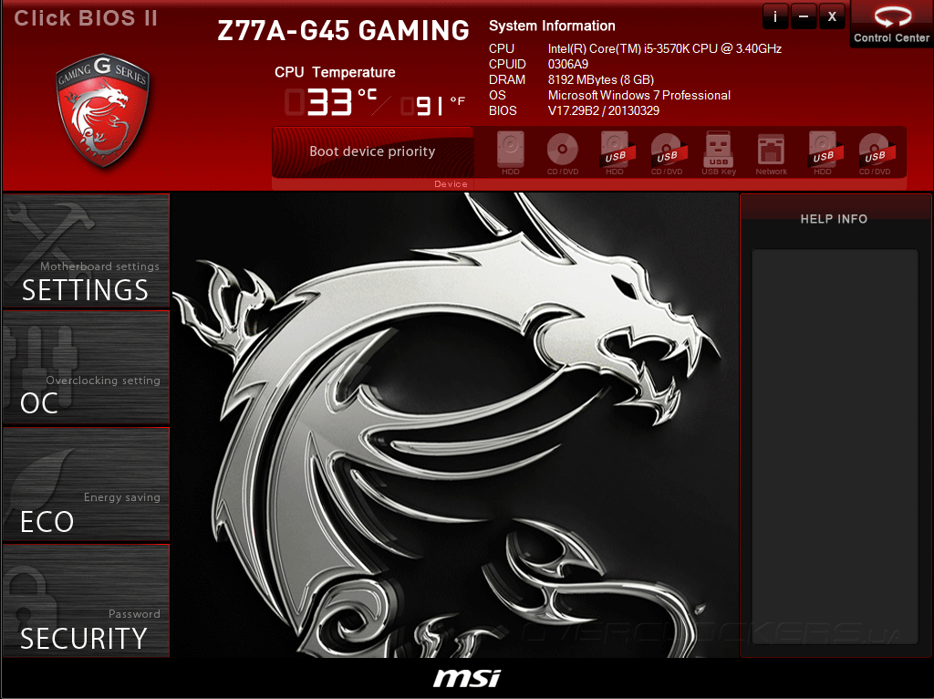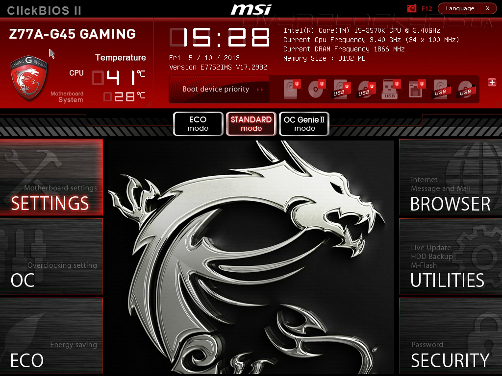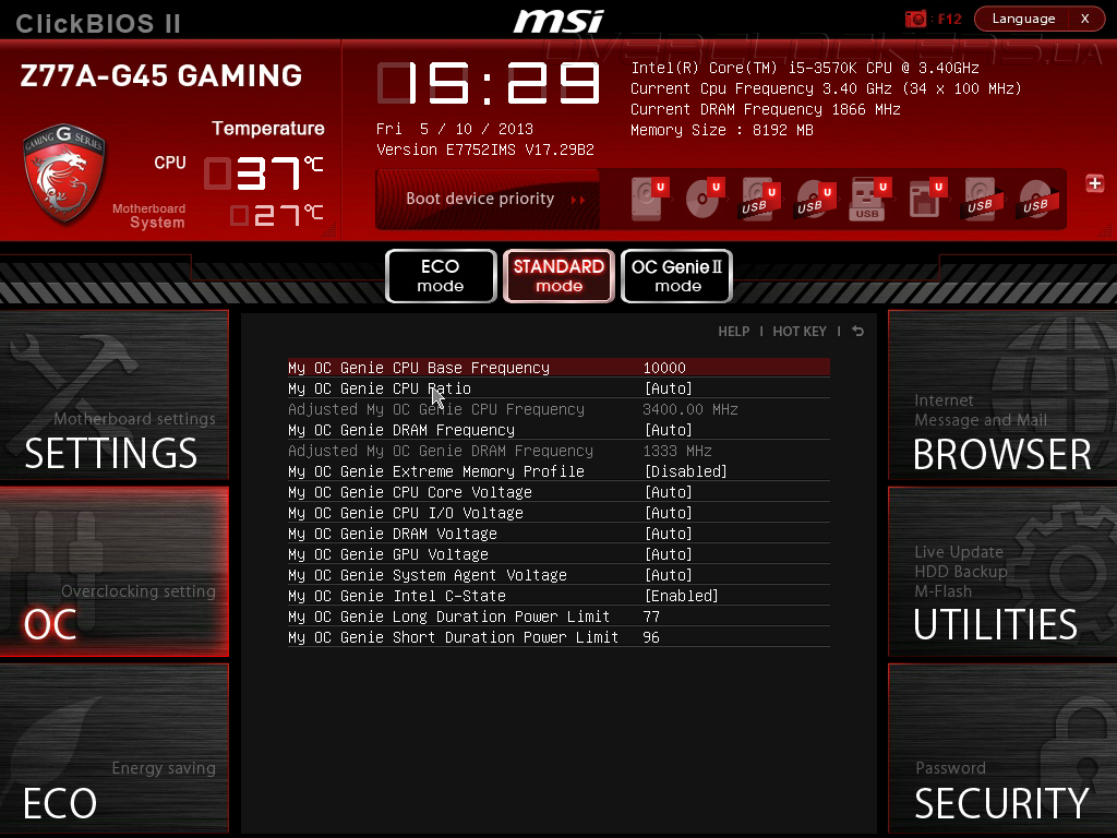 Подобно старшей модели прошивка MSI Z77A-G45 Gaming базируется на управляющем микрокоде UEFI разработки AMI. Графический интерфейс ClickBIOS II отличается от ординарных плат лишь оформлением, тогда как возможности меню настройки находятся на уровне, типичном для продуктов MSI среднего ценового диапазона. После входа в UEFI Setup пользователи могут считывать информацию об установленных процессоре и модулях ОЗУ, версии управляющего микрокода, а также снимать показания с температурных датчиков. Здесь же отображаются текущие дата и время, задается порядок устройств для загрузки и язык интерфейса. Также, пользователи могут выбрать один из трех режимов работы системной платы: ECO, активирующий все технологии энергосбережения, Standard, дающий возможности ручной настройки, а также OC Genie, при выборе которого включается функция автоматического разгона.
