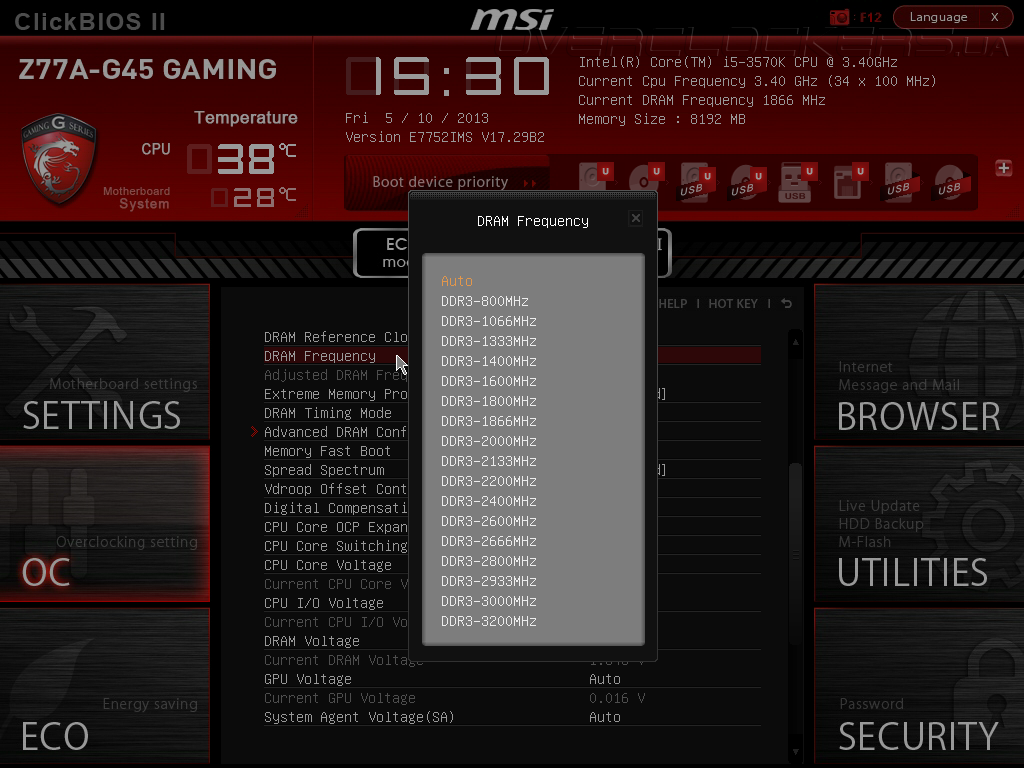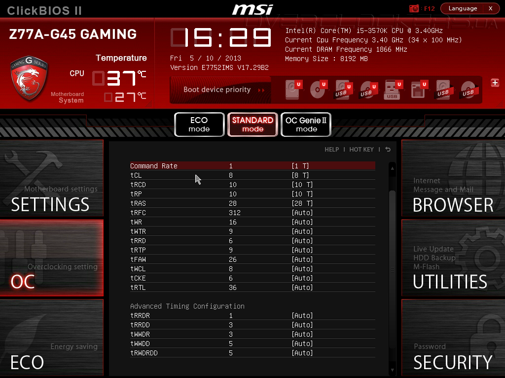 Прошивка MSI Z77A-G45 Gaming имеет все необходимые настройки для успешного разгона модулей ОЗУ. Частота оперативной памяти регулируется в широких пределах, а во вкладке Advanced DRAM Configuration задаются основные и множество второстепенных таймингов.