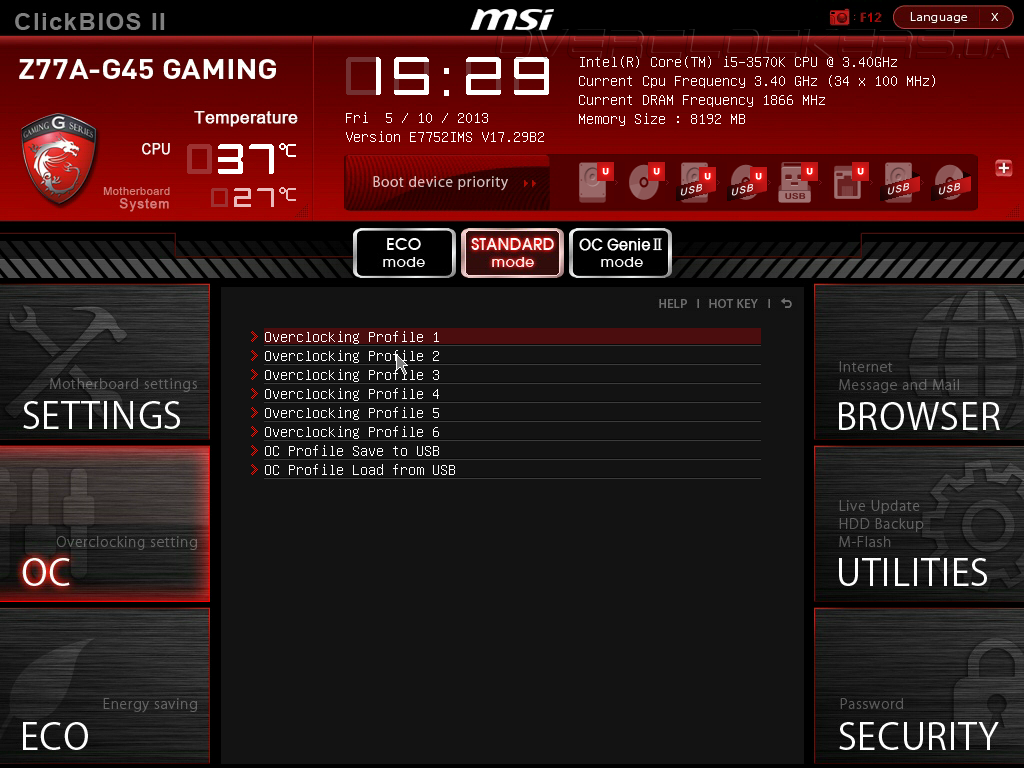 Для сохранения пользовательских настроек служит вкладка Overclocking Profile, а возможность обновления управляющего микрокода обеспечивает утилита M-Flash.