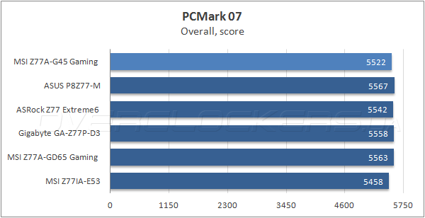 В тестовом пакете Futuremark PCMark 7, который позволяет оценить уровень быстродействия при выполнении повседневных задач, новинка демонстрирует неплохие, но отнюдь не рекордные результаты. С другой стороны, существенного отставания от лидеров у модели Z77A-G45 Gaming также не наблюдается.
