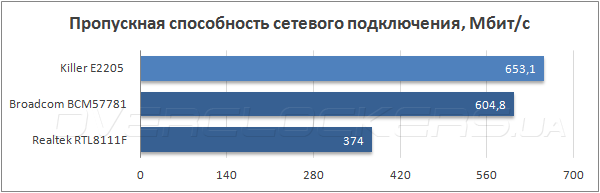 Все-таки, применение продвинутого сетевого контроллера принесло свои плоды. Killer E2205 обеспечил наибольшую пропускную способность сетевого соединения, почти вдвое опередив бюджетное решение Realtek RTL8111F, тогда как выигрыш у Broadcom BCM57781 не так велик и составил около 8%.