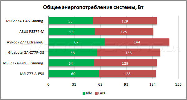 Материнская плата MSI Z77A-G45 Gaming оказалась самой экономичной в режиме простоя, тогда как в нагрузке её отставание от лидера — системной платы ASUS P8Z77-M преимущество составило не более 4 Вт.