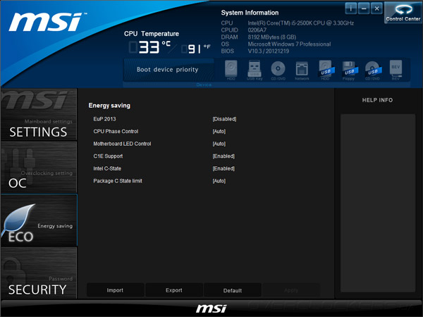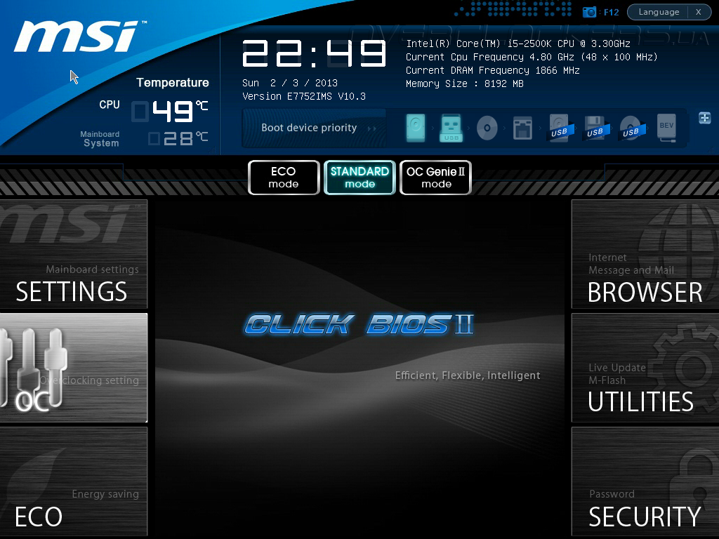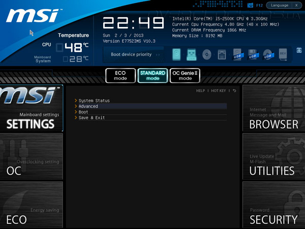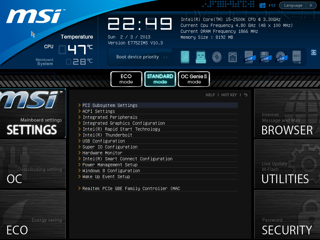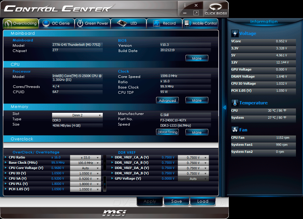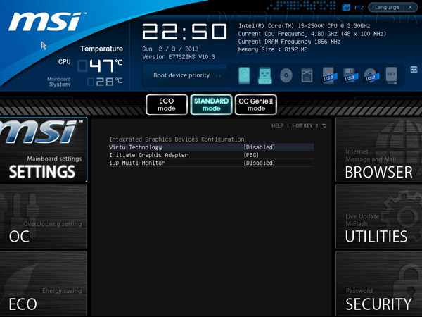 Как и большинство современных системных плат в качестве прошивки новинка использует UEFI Setup, в основе которого лежит микрокод AMI. Стандартная утилита настройки Aptio заменена на оригинальный интерфейс Click BIOS II, в результате чего повысились информативность и удобство работы. После входа в прошивку Z77A-G45 Thunderbolt пользователи могут наблюдать привычный для продуктов MSI внешний вид меню настройки. В верхней части окна отображается панель, на которой выводятся дата и время, показания термодатчиков, а также краткая информация о версии прошивки и режимах работы основных компонентов.