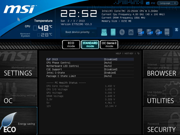 Функции экономии электроэнергии и показания датчиков напряжений на шинах питания и основных узлах системной платы вынесены в отдельный раздел прошивки ECO.