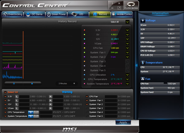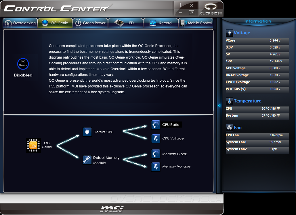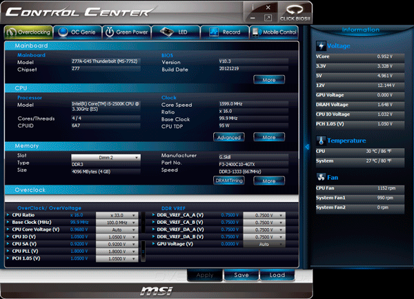 Принцип работы Click BIOS II таков, что для применения изменений необходима перегрузка, поэтому, программа не лучшим образом подходит во время экспериментов по разгону. Для управления параметрами быстродействия в режиме реального времени предназначена утилита Control Center. С её помощью в окне Overclocking можно задать значение BCLK и напряжения питания, регулировать множители процессора, тайминги подсистемы ОЗУ, а также получить исчерпывающую информацию об установленных компонентах.