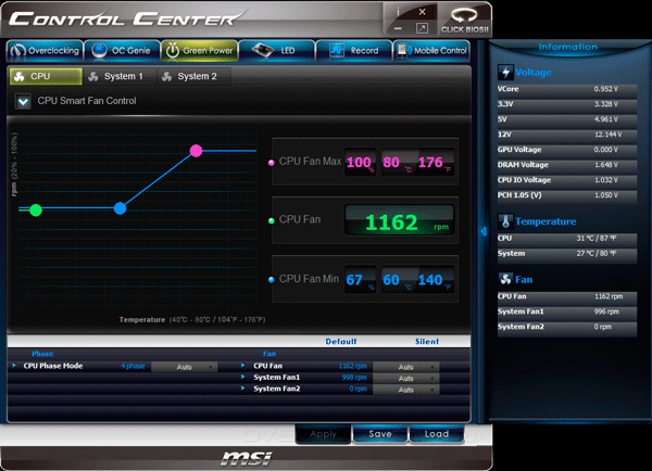 Небогатые возможности UEFI Setup по управлению вентиляторами отчасти компенсируются программой Control Center, где в разделе Green Power можно настроить режим работы трех «карлсонов» в зависимости от температуры процессора.