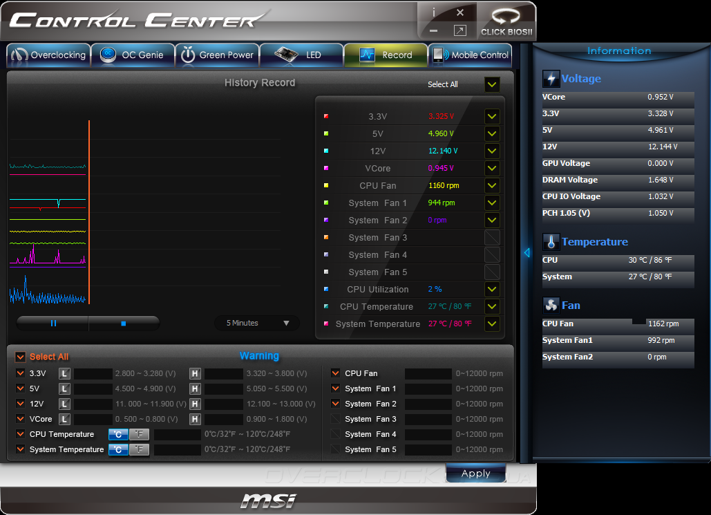 Помимо вывода показаний мониторинга на боковую панель, программа Control Center позволяет отслеживать динамику изменения параметров и сигнализировать о достижении предельных значений.