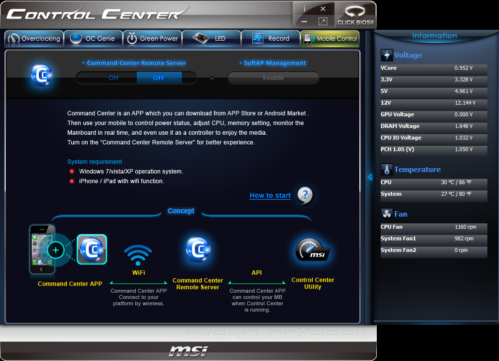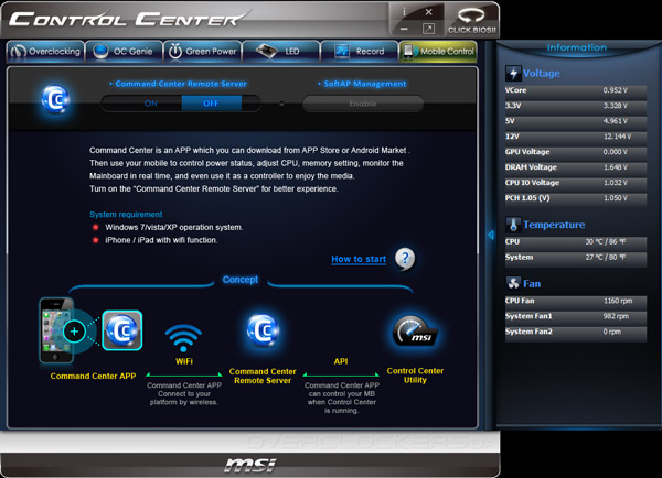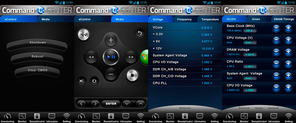 После установки на мобильное устройство приложения MSI Command Center пользователь получает возможность управления мультимедийными функциями операционной системы и параметрами разгона материнской платы, а также контроль показаний системного мониторинга.