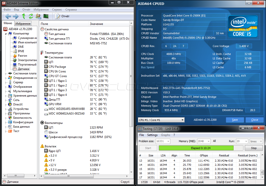 Несмотря на то, что AIDA64 фиксировала существенное уменьшение напряжения при прохождении стресс-теста LinX, система сохраняла полную стабильность. Кроме погрешности программного мониторинга напряжения отметим еще одну особенность, характерную для всех системных плат MSI — частичное отключение технологий энергосбережения в разгоне, в результате чего напряжение на процессоре не снижается в моменты простоя.