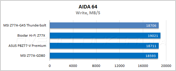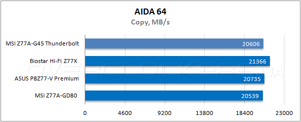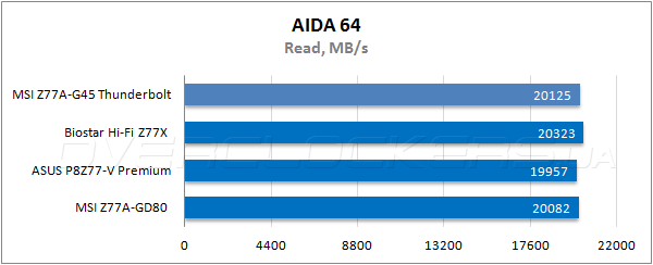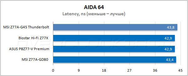 В тестах пропускной способности ОЗУ показатели MSI Z77A-G45 Thunderbolt находятся на уровне моделей конкурентов, хотя, Biostar Hi-Fi Z77X удается показать чуть лучшие результаты.